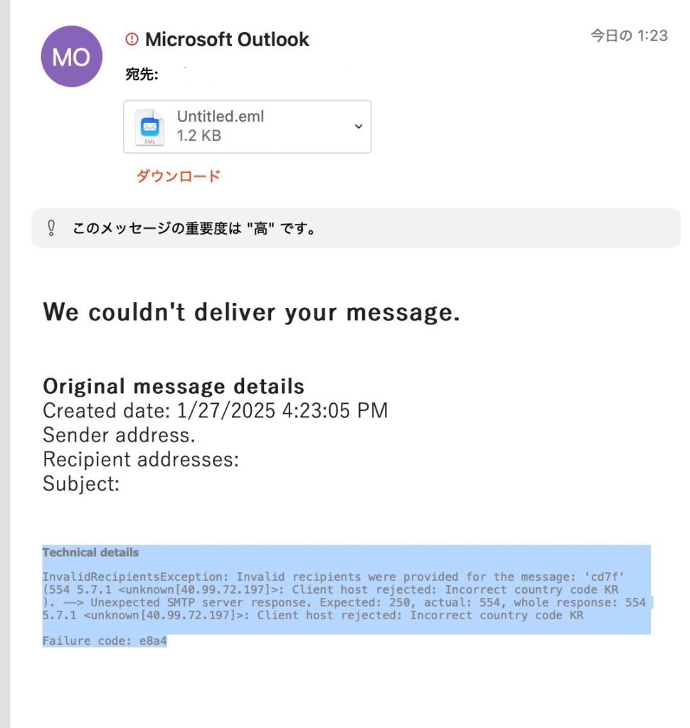 InvalidRecipients 例外:メッセージに無効な受付者が指定されました:’cd7f(554 5.7.1<不明[40.99.72.197]>:クライアントホストが拒否されました:国コードが正しくありません KR)。–>予期しないSMTPサーバー応答です。予想:250、実際: